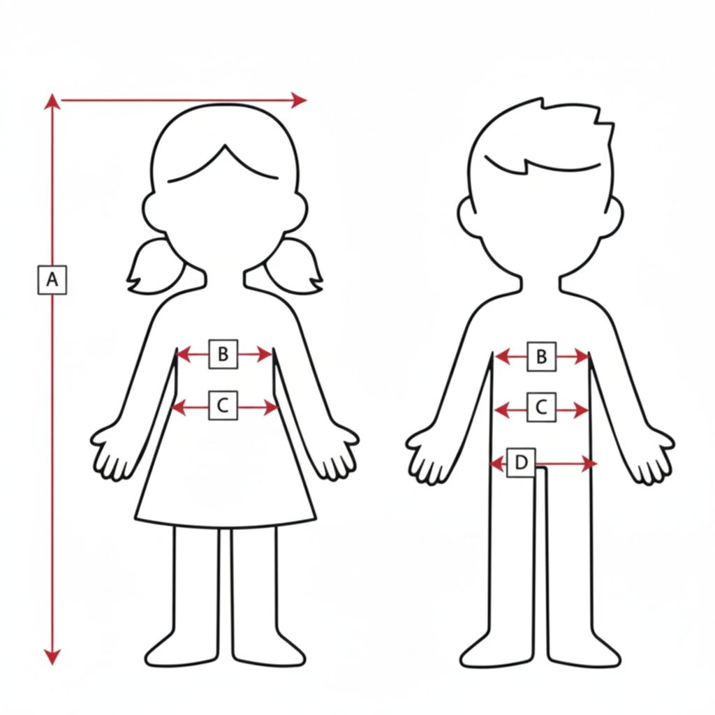 LUNGHEZZA INTERNO GAMBA Con il bambino/a a piedi scalzi e gambe leggermente divaricate, misurare dal punto centrale più alto della coscia (cavallo) fino a terra, seguendo la linea naturale dell’interno gamba.