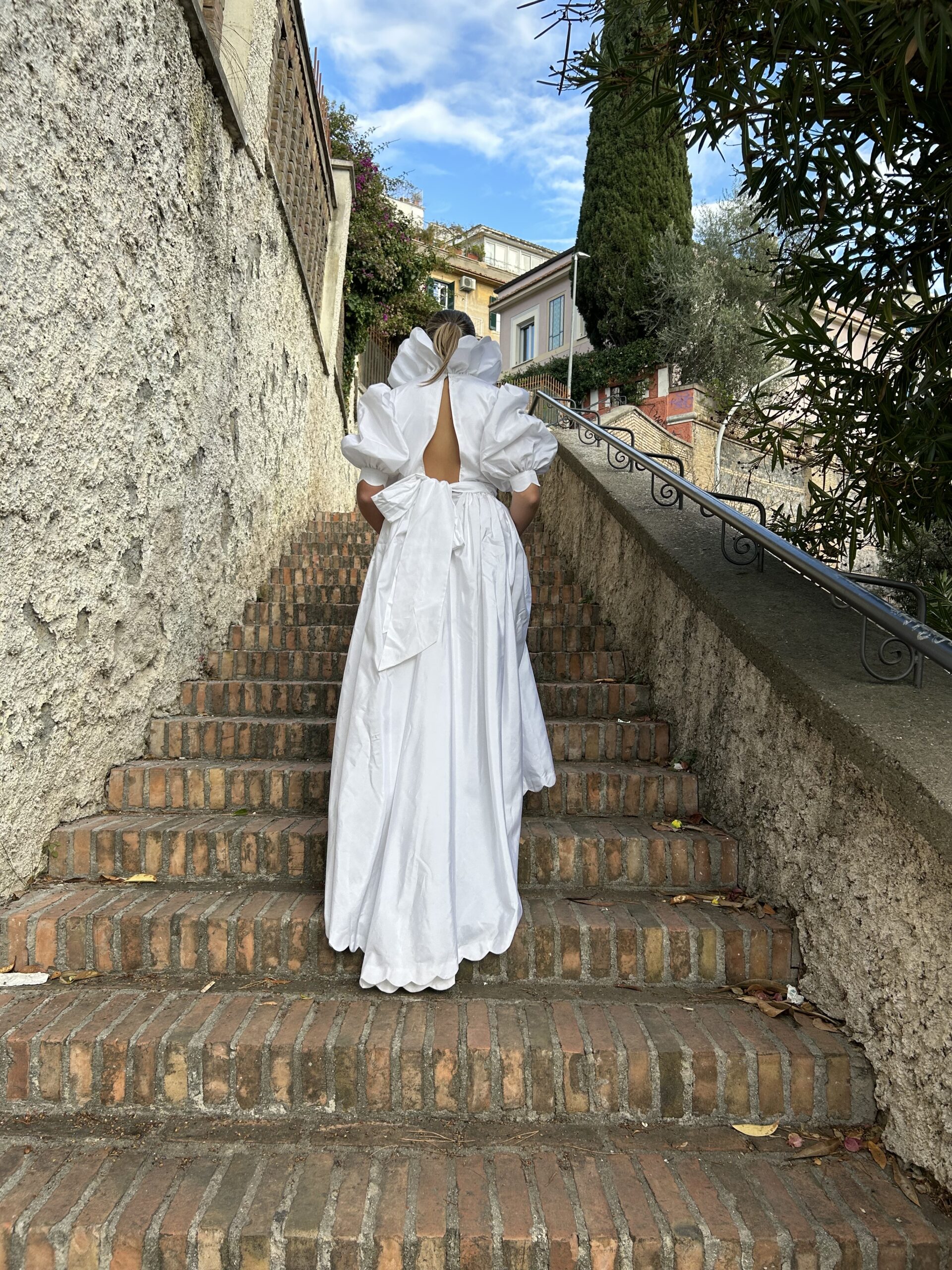 Abito da donna realizzato interamente su misura dalla nostra sartoria. Ideale sia per cerimonie eleganti che come abito da sposa, ogni dettaglio è curato artigianalmente per garantire un capo unico e di alta qualità. È possibile acquistare questo abito al prezzo di 2.000 euro oppure noleggiarlo al costo di 180 euro al giorno.